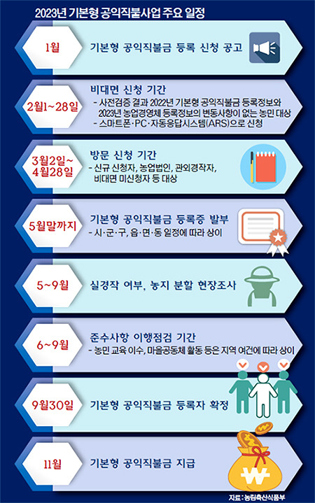 공익직불금의 신청 기간은 매년 정해져 있으며, 보통 2월부터 4월까지 진행됩니다. 2023년의 경우, 온라인 신청은 2월 1일부터 28일까지 가능하며, 오프라인 신청은 3월 2일부터 4월 28일까지 이루어집니다. 신청 기간이 지나면 신청이 불가능하므로, 미리 일정을 확인하고 준비하는 것이 중요합니다. 자세한 일정은