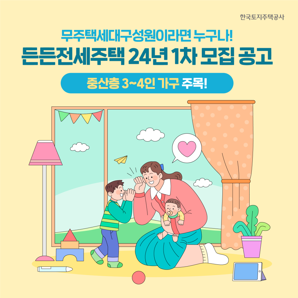 든든 전세주택은 국토교통부의 정책사업으로, 신축주택 및 아파트 등을 매입해 주변 시세의 90% 수준으로 중산층 3 ~ 4인 가구에 공급하여 8년까지 거주가 가능하도록 지원하는 공공임대주택입니다.